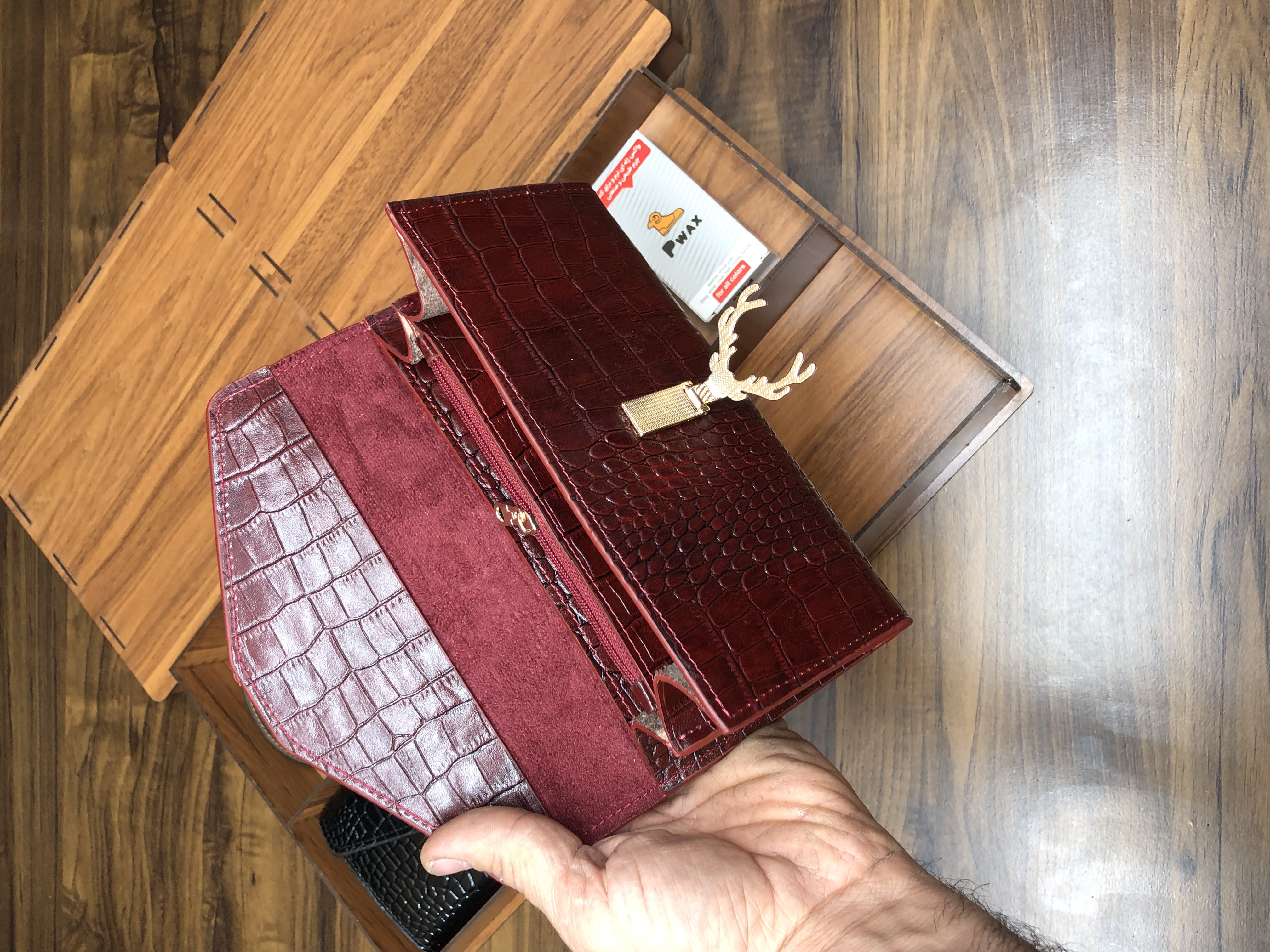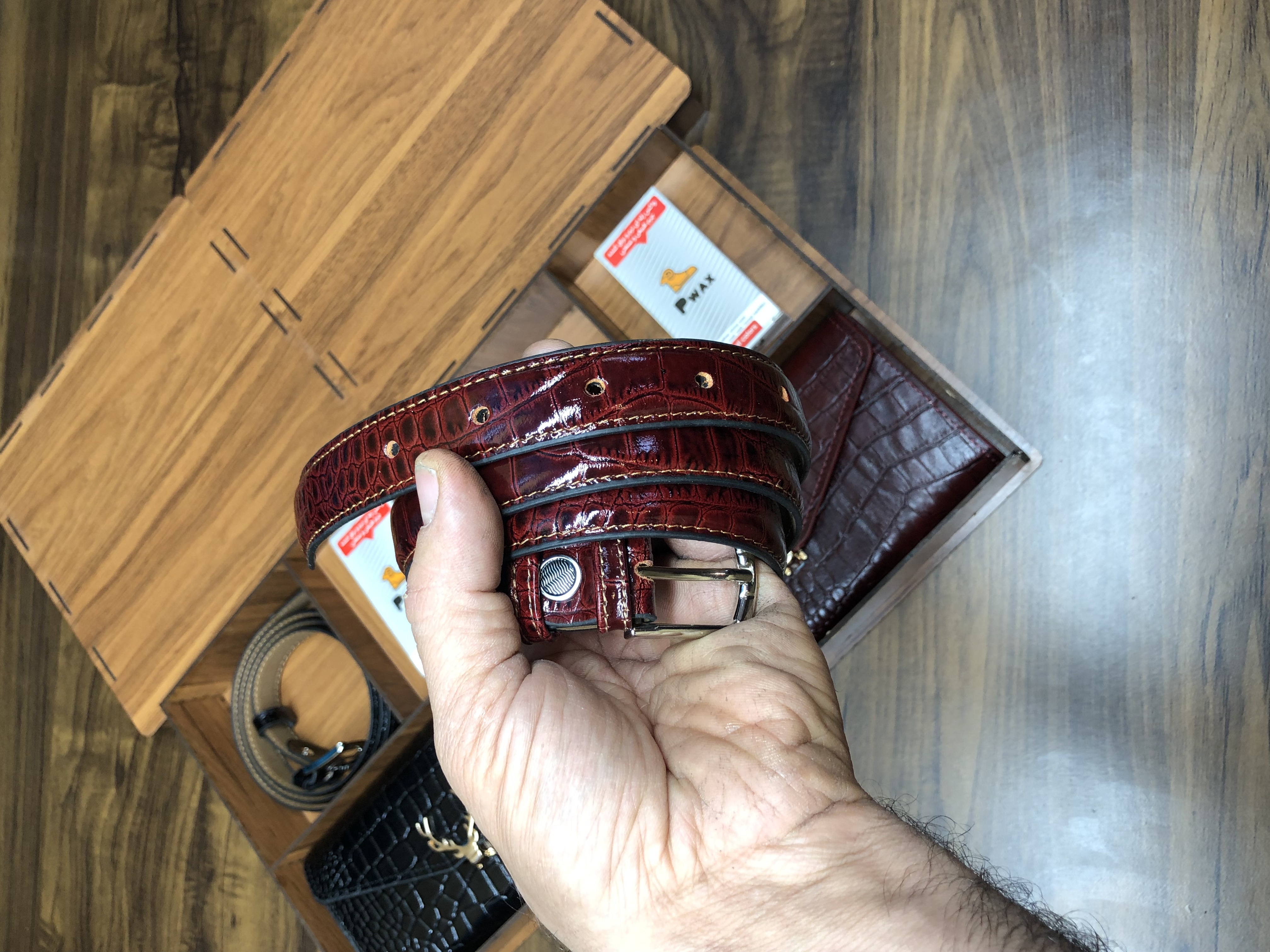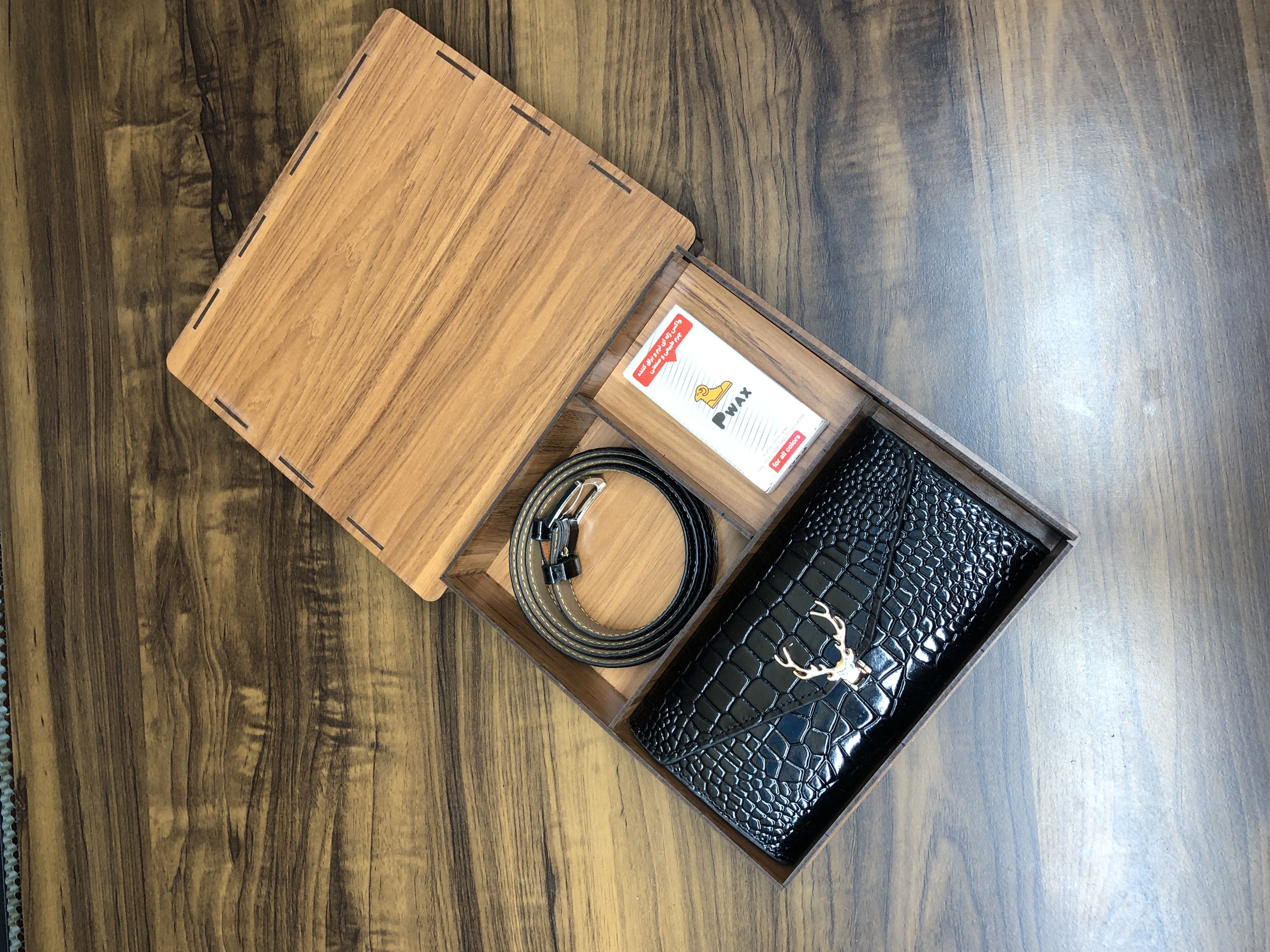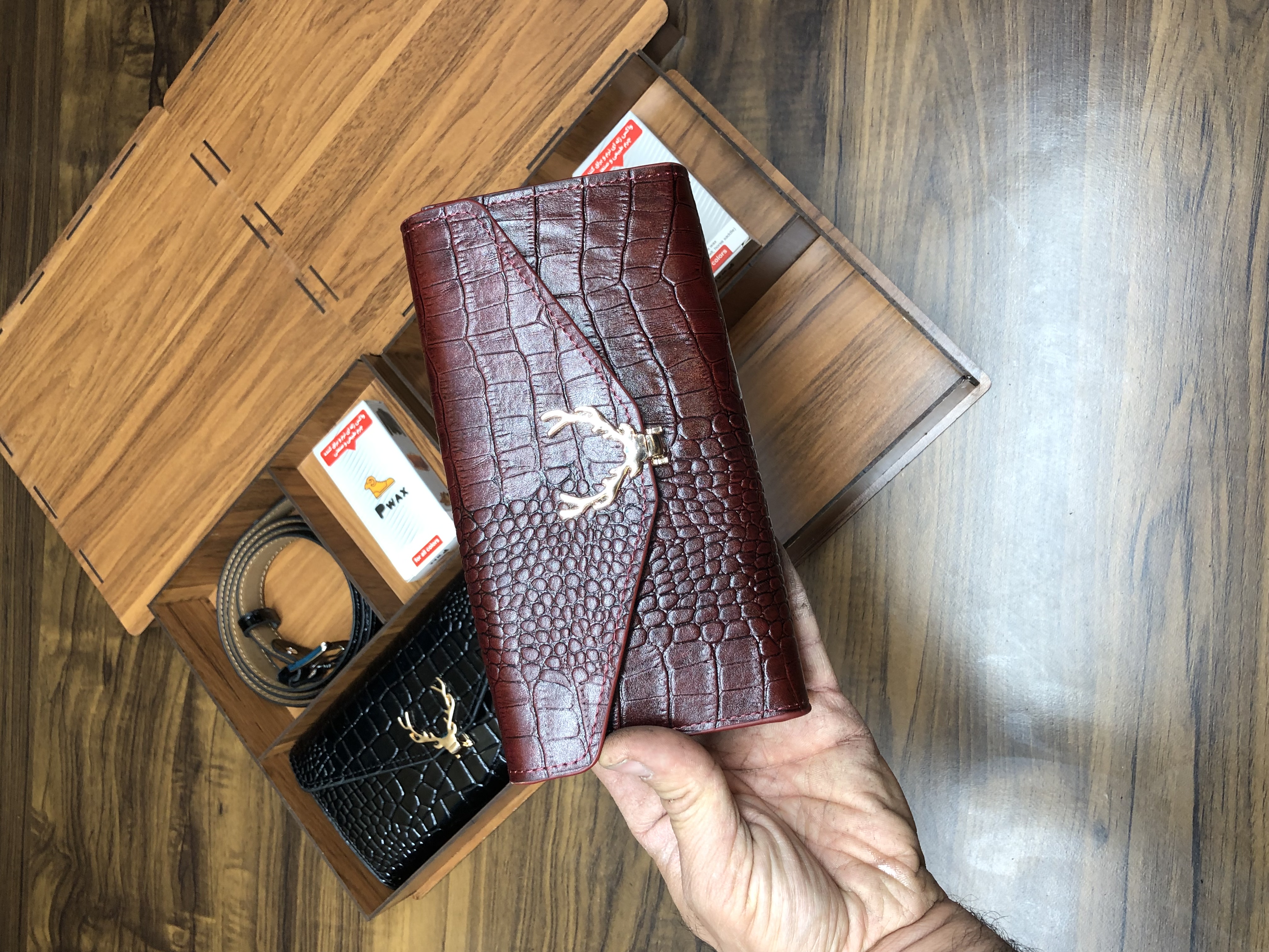 کیف شاخ گوزنی + کمربند زنانه ۲/۵ + پی واکس + جعبه